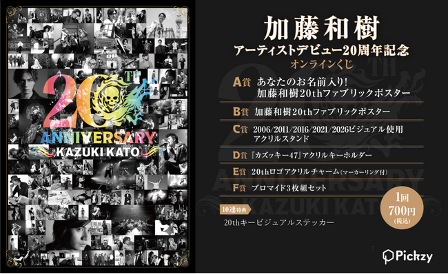 ぴあ株式会社(本社:東京都渋谷区東1-2-20 渋谷ファーストタワー/代表取締役社長:⽮内 廣)は、オ ンラインくじサービス「Pickzy(ピクジー)」(https://pickzy.pia.jp/)にて、2026年4月26日(日)にアーティストデビュー20周年を迎えた加藤和樹のオンラインくじを販売開始いたしました。「Pickzy」は、 PCやスマートフォンから手軽にくじを引くことができ、はずれなしで限定グッズやコンテンツが必ず手に 入る、ぴあ株式会社が提供するオンラインくじサービスです。