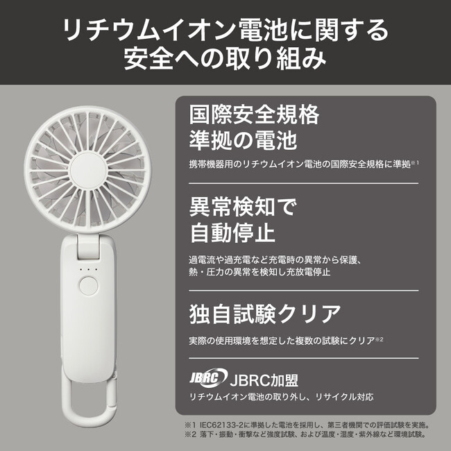 当社ハンディファンでは、お客様に安心して製品をご使用いただくため、電池の品質、安全制御、製品設計および信頼性評価の各段階において各種安全対策を実施しております。