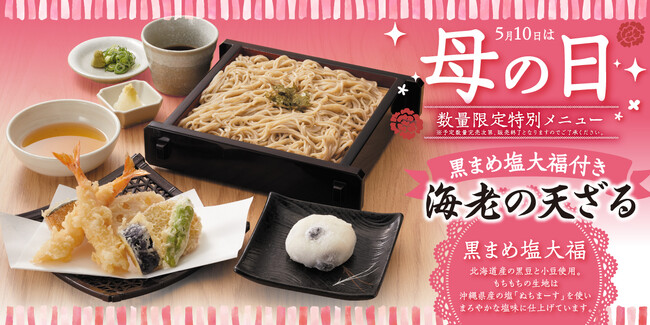 メインとなるのは、プリッとした海老の天ぷらを盛り合わせた「海老の天ざる(そば/うどん)」に、北海道産黒豆と国産小豆を使用した黒まめ塩大福を添えた、数量限定のセットメニュー。食後までやさしい余韻を楽しめる、母の日ならではの一品です。
