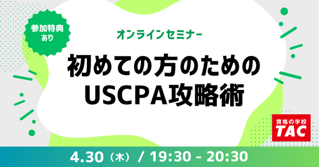 【資格の学校TAC】オンラインセミナー「初めての方のためのUSCPA攻略術」 2026年4月30日(木)19:30開催!