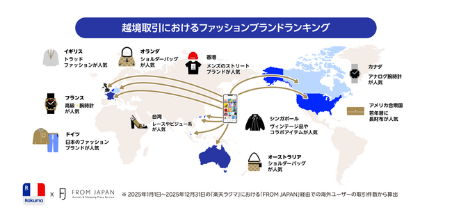 楽天グループ株式会社(以下「楽天」)が運営するフリマアプリ「楽天ラクマ」と、株式会社FROM JAPANが海外在住のユーザー向けに運営する越境ECサイト「FROM JAPAN」は、「楽天ラクマ」における越境取引データを基に、国・地域別で取引数が多いファッションブランドのランキングを発表しました。本調査は2024年から実施し今回が3回目で、「FROM JAPAN」において、2025年の1年間に「楽天ラクマ」を通じて取引されたファッションブランド品の実績に基づき、特に取引数が多い10の国・地域ごとにランキング形式で集計したものです。