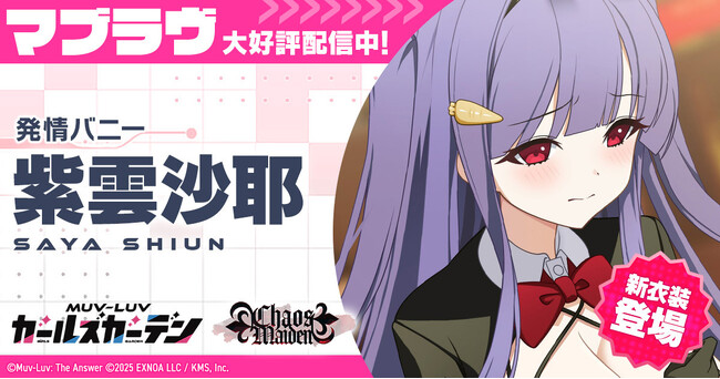 合同会社EXNOA(本社:東京都港区、CEO:東條 寛、URL:https://games.dmm.com/)と株式会社KMS(本社:東京都品川区、代表:梶原 健太郎、URL:http://kms3.com/)が贈るマブラヴ最新作『マブラヴ ガールズガーデン』(以下、マブガル)が、新イベント「Chaos in casino」後半を開始し、新SSR「紫雲 沙耶」が登場したことをお知らせいたします。