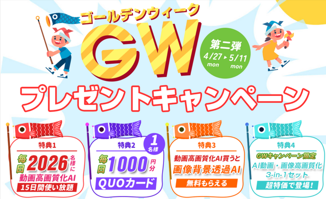 Digiartyは「2026 GWプレゼントキャンペーン」で、QUOカード1000円分を毎日抽選で1名様にプレゼントします。特設トストアページ:https://jp.aiarty.com/campaign/festival-present.htm