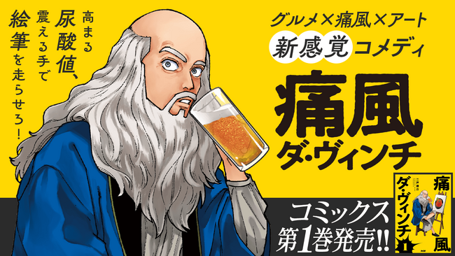 『痛風ダ・ヴィンチ』は、天才画家レオナルド・ダ・ヴィンチの視点で現代グルメを食べつくす、グルメ×痛風×アートの新感覚コメディ作品です。史実でも痛風を患っていたとされるダ・ヴィンチが、現代日本へタイムスリップしたことをきっかけに、抑えていた食への欲求が爆発。創作活動の礎とすべく(?)暴飲暴食を重ねてしまう……そんな主人公のだらしなく愛らしい姿がポップに描かれます。