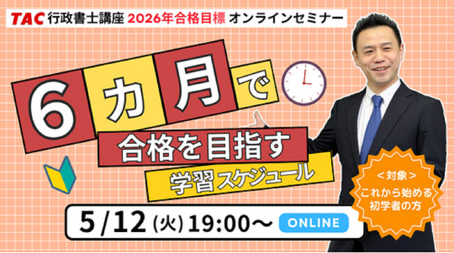 行政書士試験対策講座を展開しているTAC株式会社(東京都千代田区)は、行政書士試験へはじめて挑戦しようとお考えの方を対象に、無料オンラインセミナーを5/12(火)19時より開催します。