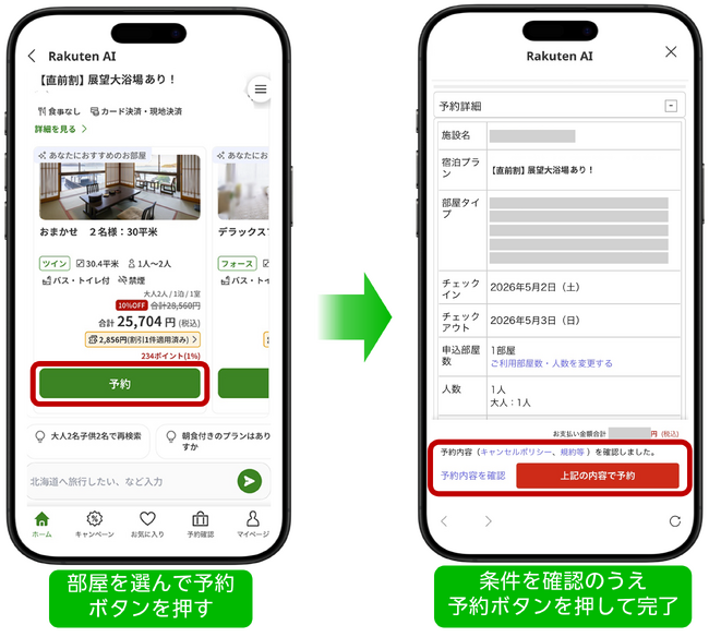 このたび、「Rakuten AI」に予約機能を追加したことにより、最適な宿泊施設の提案から予約までをAIが一貫してサポートできるようになりました。ユーザーは宿泊日や施設に求める設備、重視したい点などの希望条件をAIに伝え、複数の候補から最適な宿泊施設やプランを選択し、希望条件が反映されていることを確認したうえで、予約ボタンから簡単に予約を完了することが可能です。事前に楽天IDでログインすることで、獲得予定ポイントや各ユーザーが利用できる割引条件を反映した料金を確認できるほか、予約時に氏名や連絡先、カードの決済情報などの入力が不要となり、宿泊先の決定から予約まで、スムーズに手続きを進めることが可能となります。