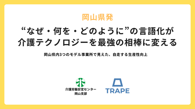 介護現場の生産性向上に関するガイドラインの作成など、2017年から国の施策づくりに関わり介護分野の変革をリードしてきた株式会社TRAPE(本社:大阪府大阪市、代表取締役社長:鎌田大啓)は、ウェルビーイングにあふれた介護事業所の実現を目指し、現場の業務改善やDXに不可欠な「チームづくり」や「課題の見える化・分析」を支援する無料のオンラインツール「生産性向上くん(R)」の提供と、「生産性向上」「働きがい向上」「リーダー育成」を同時に実現する伴走支援サービス「Sociwell(ソシウェル)」を展開する中で、令和7年度 岡山県介護生産性向上総合相談センター様(公益財団法人介護労働安定センター岡山支部様が岡山県より受託)の業務アドバイザーを受託し、岡山県内で生産性向上の取組みを行う3つのモデル介護事業所に対して伴走支援を実施しました。