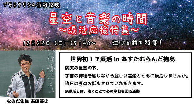 泣いてストレスを解消する『涙活(るいかつ)』を行う涙と旅カフェあかね(所在地:東京都新宿区西早稲田2-1-17酒井ビル1F)の吉田 英史は、2019年12月22日(日)に徳島県板野郡にあるアミューズメントパーク「あすたむらんど徳島」で、『星空と音楽の時間「涙活応援特集」』と題して、当パークのプラネタリムで『涙活イベント』を監修し、登壇する運びとなりました。